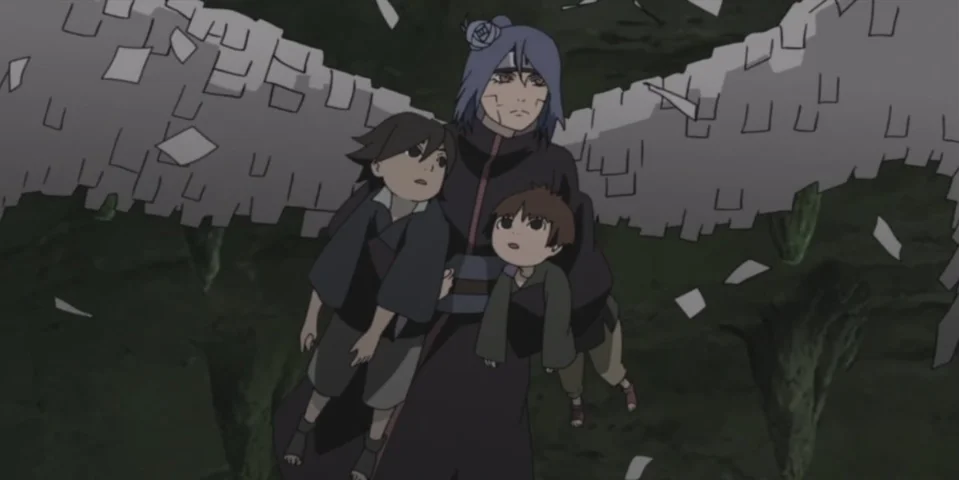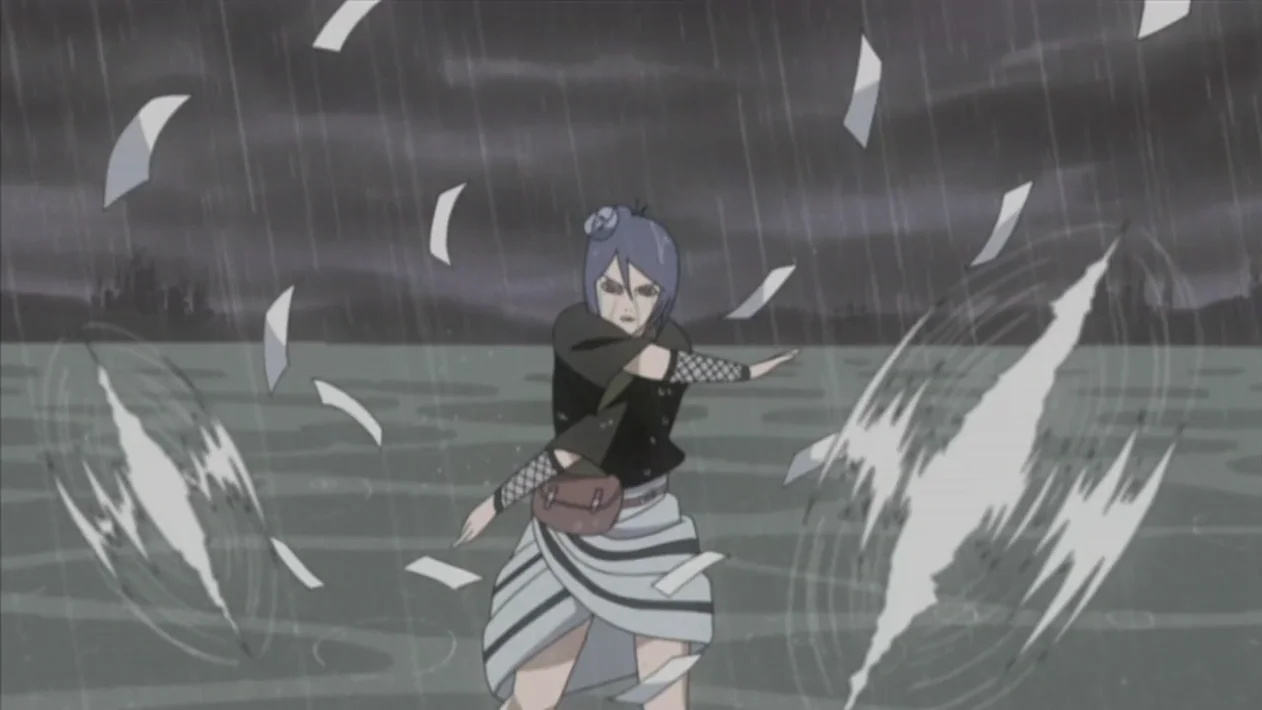 코난은 이미 '신성한 잎' 기술(시카가미 노 마이)을 익혀 자신의 몸과 옷을 종이로 변환할 수 있지만, 아직 그 숙달도는 최고 수준에 도달하지 못했다. 그녀는 종이로 날개를 만들어 비행하거나, 종이 시트에서 자신의 복제체를 만들고, 종이의 날카로운 가장자리로 공격하며, 종이를 이용해 정찰할 수 있다. 이 시기에 그녀는 또한 종이에 폭폭 인장을 넣어 공격을 강화하는 폭폭 인장을 적극적으로 사용한다. 그녀의 전투 스타일은 지라이야의 영향을 받아 형성되고 있는데, 그녀는 그에게서 전투에서 다양한 요소들을 결합하는 아이디어를 배웠지만, 그녀는 여전히 종이에만 제한되어 있다. 그녀는 아직 '종이 소용돌이'와 같은 거대 구조물을 만들어내지 못하며, 그녀의 기술 규모는 작은 형성들과 종이 무리들에 한정되어 있다. 아마가쿠레의 적들과 전투 시 그녀는 야히코와 나가토와 함께 팀을 이루어 싸우며, 종이를 이용해 엄폐, 분산 및 원거리 공격을 수행한다.